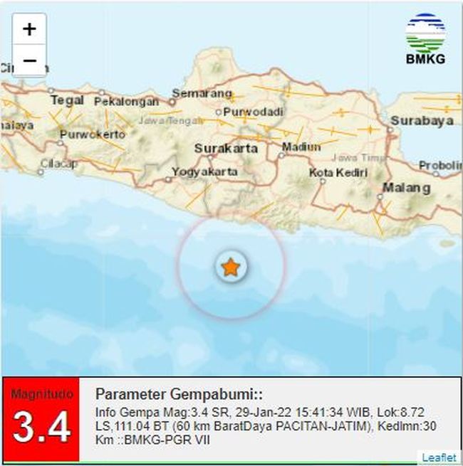 Gempa bumi kembali mengguncang Pacitan. Setelah gempa M 3.0 terjadi pukul 15.09 WIB, kali ini gempa Pacitan berkekuatan M 3.4 terjadi pukul 15.41.34 WIB, Sabtu (29/1/2022).
