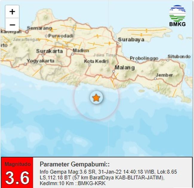 Gempa bumi bermagnitudo 3,6 mengguncang wilayah Blitar, Jawa Timur. Gempa Blitar ini terjadi pukul 14:40:18 WIB.