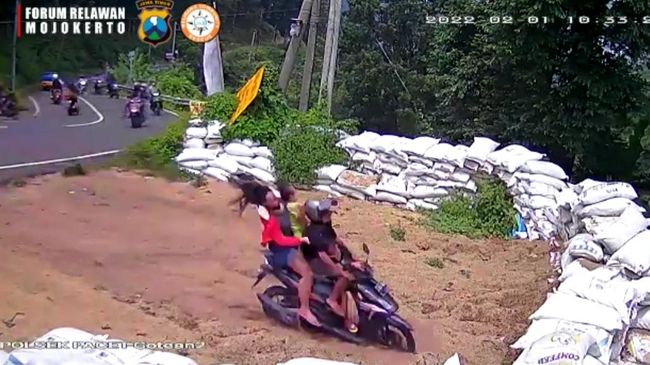 Sepeda motor tersebut dikemudikan Anto (34), warga Desa Mlaten, Puri, Mojokerto. Ia membonceng istri, Suci (33) serta dua anaknya, Arjuna (9) dan Attaki (2).