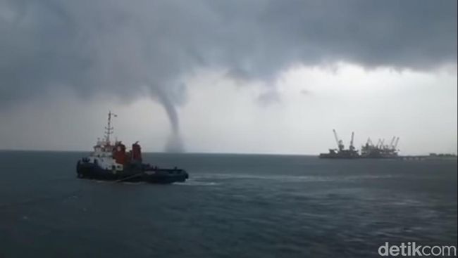 Dalam rekaman video tersebut, angin itu muncul ditandai awan tebal terbentuk di langit. Setelah itu hujan deras turun dan langsung membentuk pusaran air dengan jarak sekitar 2 km dari bibir pantai.