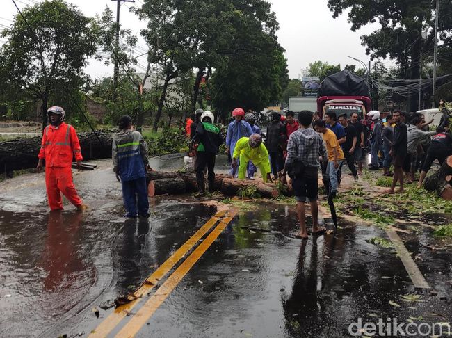 Ada 5 pohon yang tumbang di jalan tersebut, setelah hujan mengguyur disertai angin kencang. Meski pohon-pohon yang tumbang sudah dievakuasi, namun lalu lintas masih merambat.
