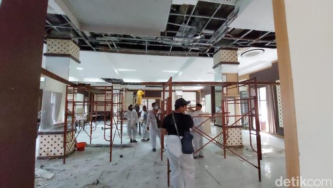Di lantai dasar, banyak pekerja yang memperbaiki titik dan sudut ruangan seperti plafon yang berlubang. Plafon tersebut dibenahi, ditambal, dan dicat hingga rapi.
