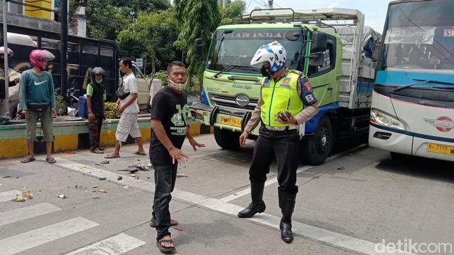 Karena mengantuk, truk yang dikemudikan Sang Made (44) menabrak 2 motor dan 1 mobil yang tengah berhenti saat lampu merah menyala. akibatnya 2 motor yang ditabrak tergencet di antara truk dan mobil.