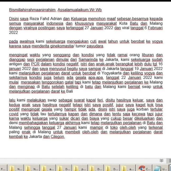 "Disini saya Reza Fahd Adrian dan Keluarga memohon maaf sebesar-besarnya kepada semua masyarakat indonesia dan khususnya masyarakat Kota Batu dan Malang dengan viralnya postingan saya tertanggal 27 Januari 2022 dan viral tanggal 6 Februari 2022," tulis luckyreza seperti yang dilihat detikjatim, Selasa (9/2/2022).