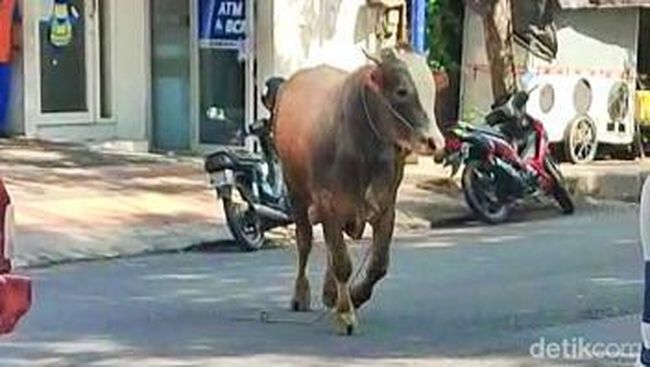 Seekor sapi lepas dan mengamuk di Banyuwangi. Sapi lepas di jalanan itu membuat arus lalu lintas macet.