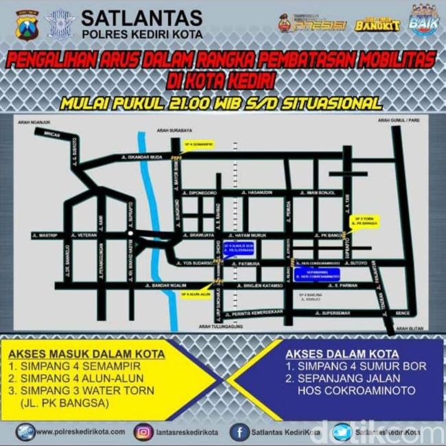 Status Kota Kediri saat ini adalah PPKM level 3. Satgas COVID-19 bersama Polres Kediri Kota langsung memberlakukan pengalihan arus lalu lintas di sejumlah jalan protokol.