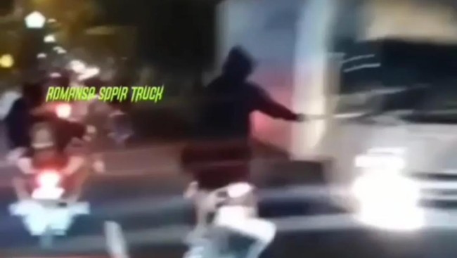 Pemuda yang dibonceng berdiri sembari mengangkat tongkat. Mereka menyambut sebuah truk boks yang datang dari arah berlawanan. Pelaku lantas memukul kaca spion truk dengan tongkat tersebut.
