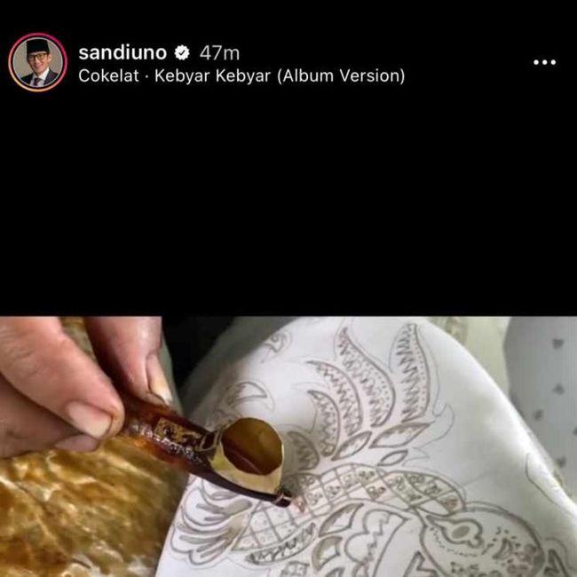Dalam unggahan di IG @sandiuno yang diposting Rabu (9/2) sore itu, Sandiaga memposting reel proses pewarnaan batik pesanan Justin Holiday. Dengan background lagu Kebyar-Kebyar yang dinyanyikan Tantri Kotak, Sandi mengajak bangsa Indonesia bangga dan memakai produksi anak bangsa. Seperti caption berikut ini