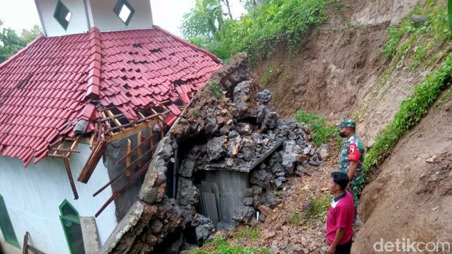 "Sejak kemarin sore sampai malam terjadi hujan dengan instensitas tinggi. Kondisi tersebut mengakibatkan tembok penahan tebing di belakang Musala Al Ikhlas longsor," kata Tri Puspitasari kepada detikJatim, Minggu (14/2/2022).
