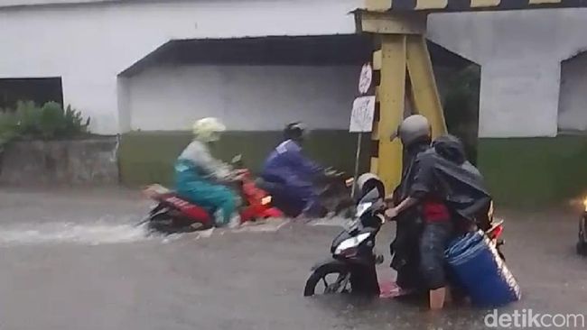 Ketinggian banjir di jalan lebih dari separuh roda motor. Meski air cukup tinggi, banyak kendaraan roda empat dan roda dua nekat menerobos banjir.