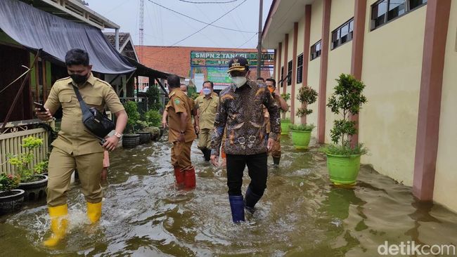 "Selain itu permukaan air sungai Balongdowo penuh. Mengakibatkan halaman dan ruang sekolah tergenang air. Untuk sementara semua murid belajar dengan sistim darring," kata Khoiri.