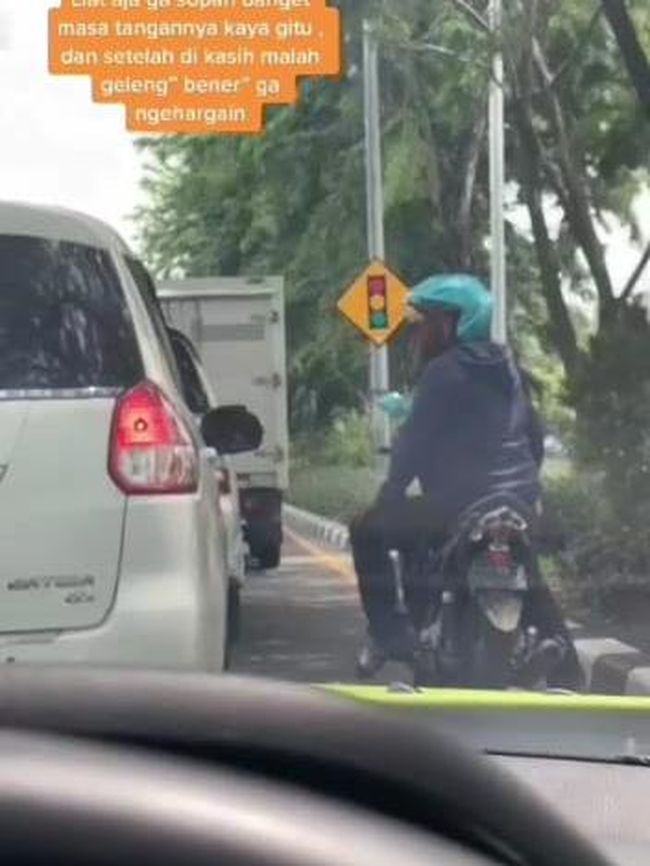 Pengendara tersebut juga memelas. Dia mengatakan uang tersebut hendak digunakan untuk membayar sekolah anaknya. Namun, setelah diberi uang, si pengendara langsung pergi dengan membleyer motornya dengan kencang.