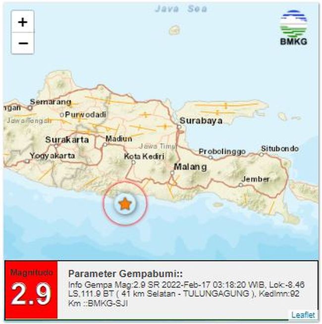 Gempa bumi guncang Tulungagung. Kali Gempa Tulungagung bermagnitudo 2.9.
