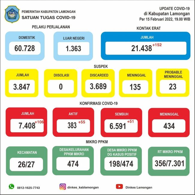 Data yang ada di Dinkes Lamongan per 15 Februari, angka terkonfirmasi positif COVID-19 aktif sebanyak 383 pasien atau naik 55 pasien dari hari sebelumnya. Sementara, Untuk Bed Occupancy Rate (BOR) di Lamongan hingga saat ini adalah 17,42 persen.