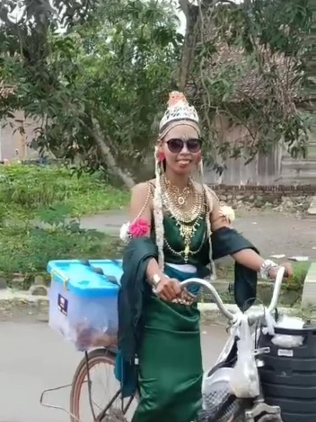 Penjual gorengan tersebut diketahui bernama Giarti, warga desa Klumutan, Kecamatan Saradan, Madiun. Wanita 30 tahun itu tampak mengenakan kostum ratu pantai selatan dan menaiki sepeda angin sambil membawa jualannya.