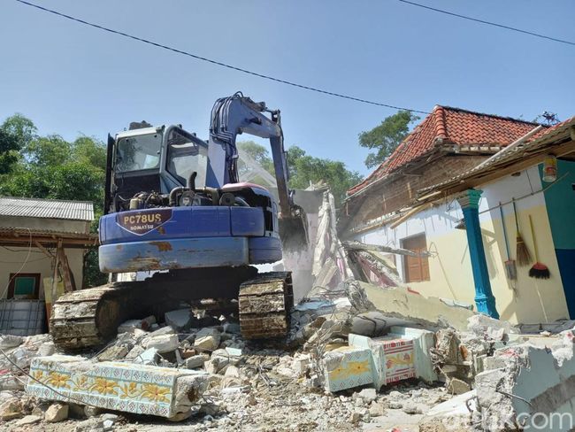 Sebuah backhoe merobohkan bangunan tersebut. Sementara dua truk mengangkut material bangunan yang dibongkar.