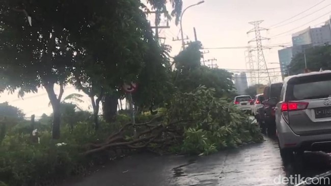 "Banyak pohon tumbang di sepanjang Jalan Panjang Jiwo Kali Jagir. Ada lebih dari 10 pohon tumbang, menyebabkan kemacetan kendaraan ke arah Novotel Samator," kata Odi, Senin (21/2/2022).