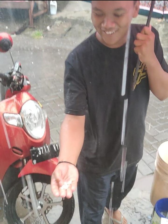 Dia mengaku selama ini hanya mendapat cerita saat hujan es. Namun kali ini dirinya mengalami sendiri jika tempatnya berteduh terjadi hujan es.
