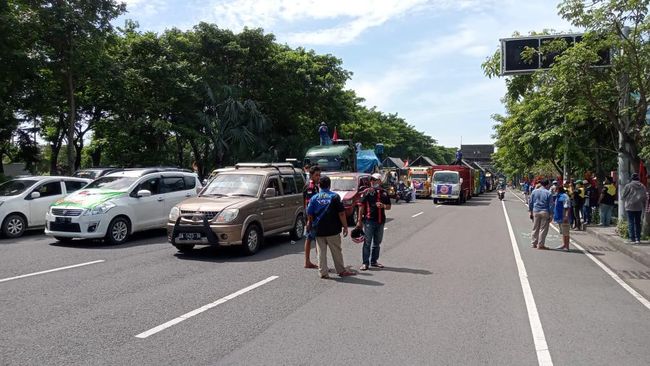 Pengguna jalan yang melintas di Jalan Ahmad Yani terjebak kepadatan. Rupanya kepadatan ini dikarenakan ada ratusan sopir truk melakukan aksi demo di depan kantor Dinas Perhubungan (Dishub) Jatim Jalan Frontage Ahmad Yani Surabaya.