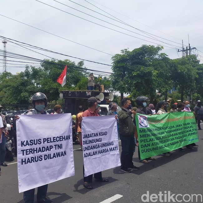 Dari pantauan detikJatim, massa melakukan orasi dan juga membawa sejumlah banner bertuliskan 'Kasus Pelecehan Terhadap TNI Harus Dilawan' dan 'Jabatan KSAD Dilindungi Undang-Undang Adalah Harga Mati'.