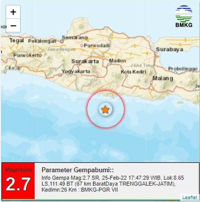 Gempa berkekuatan magnitudo 2,7 guncang Trenggalek. Gempa Trenggalek ini terjadi pukul 17:47:29 WIB, Jumat (25/2/2022).