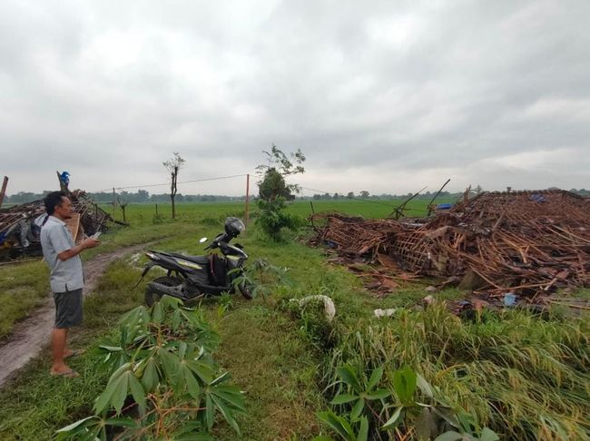 Hujan disertai angin kencang menyebabkan belasan bangunan di dua desa Kecamatan Nguling, Kabupaten Pasuruan rusak. Dua bangunan kandang ayam ambruk.