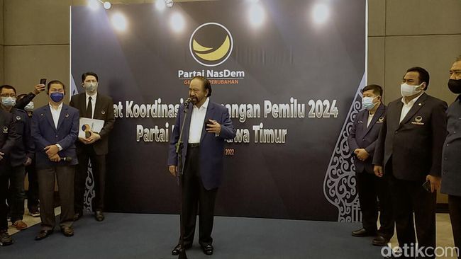 "Saya ingin menyatakan belum tertarik membahas masalah ini. Itu jelas belum tertarik. Kita ingin mengkonsolidasikan urusan yang lain," ujar Ketua Umum Partai Nasdem Suryo Paloh kepada wartawan sebelum membuka Rakor Pemenangan Partai Nasdem Jawa Timur di Dyandra, Surabaya Senin (28/2/2022).