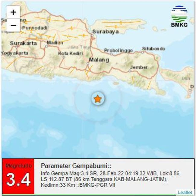 Jatim diguncang tiga gempa hari ini. Satu gempa mengguncang Malang dan dua gempa mengguncang Pacitan.