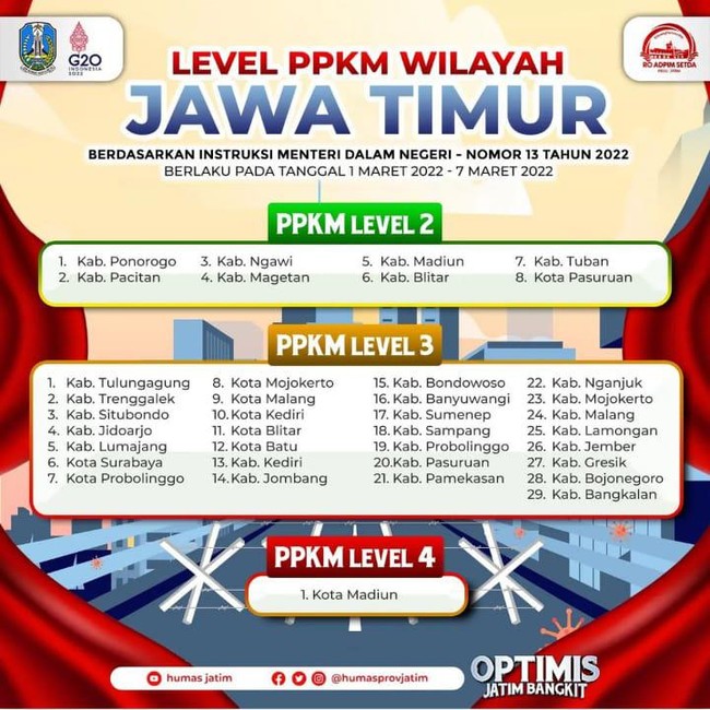 "Saudaraku warga Jatim yang baik. Peta level PPKM sesuai Inmendagri no 13 tahun 2022 berlaku 1-7 Maret masih seperti di atas. Mohon tetap jaga protokol kesehatan, percepat vaksinasi dan jangan lengah meski kasus per hari sudah mulai menurun tetapi angka mortalitas masih perlu diwaspadai. Salam sehat semuanya," kata Khofifah di Surabaya, Selasa (1/3/2022).