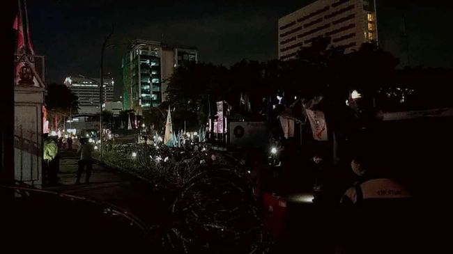 Lampu Penerangan Jalan Umum (PJU) di Jalan Gubernur Suryo depan Gedung Negara Grahadi Surabaya sengaja dipadamkan, Selasa (1/3/2022) petang. Itu dilakukan saat ribuan buruh memilih bertahan di depan Gedung Grahadi. Melihat itu, buruh justru menyalakan flashlight ponsel.