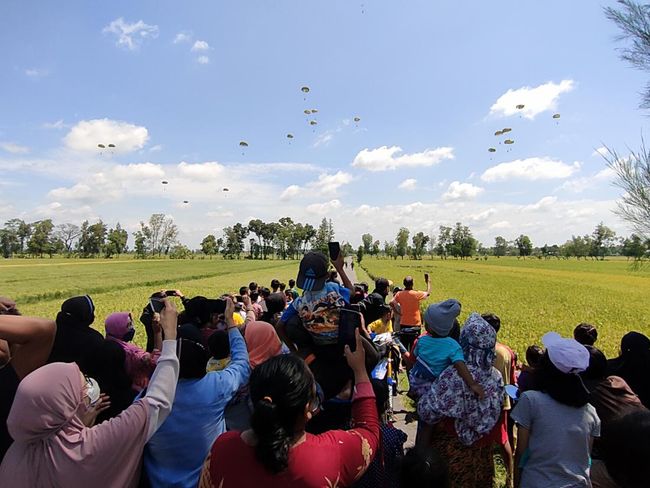 Kegiatan itu disambut animo warga desa. Terutama saat melihat ratusan anggota TNI keluar dan terjun dari pesawat terbang yang melintas cukup rendah di area persawahan.