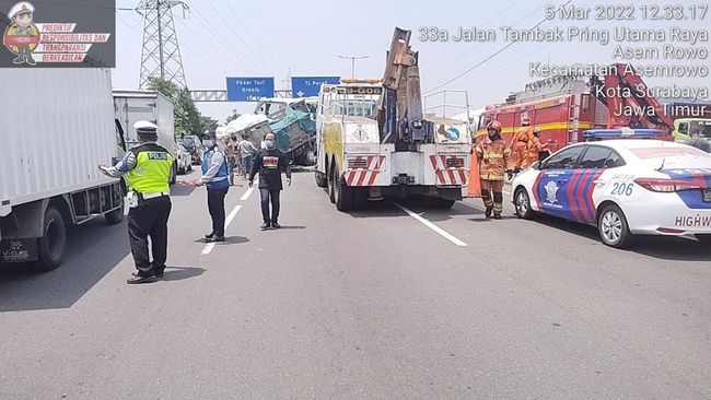 Korban tewas kecelakaan antara truk dan bus pariwisata terjadi di Tol Dupak arah Waru KM 4.100, Sabtu (5/3/2022) bertambah. Korban tewas menjadi 3 orang.