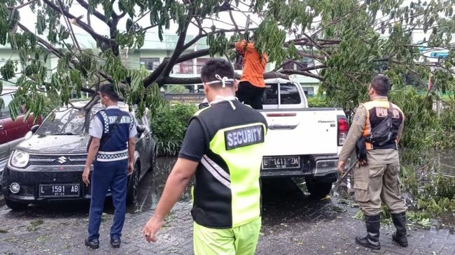 Hujan ringan menerpa Kota Surabaya siang hingga sore hari menyebabkan pohon tumbang. Pohon tumbang di halaman parkir RS PHC menimpa mobil.