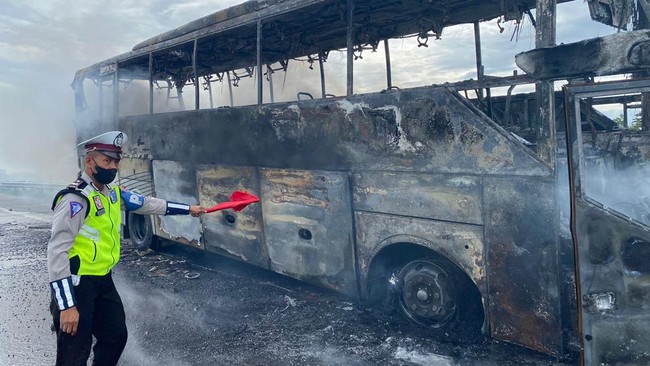 "Di dalam bus ada penumpang 48 orang selamat semua, busnya habis terbakar, seluruh badan bus habis terbakar sama isinya juga, sekaligus oleh-oleh yang dibawa rombongan," tambahnya.