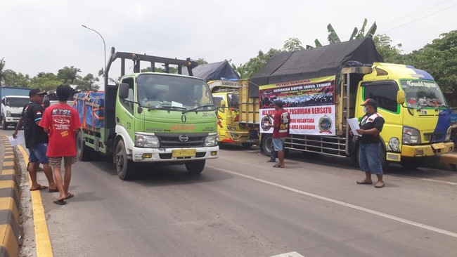 Pantauan di lokasi, puluhan sopir dari 5 komunitas berkumpul di jalan masuk dan keluar tol. Mereka mengaku mewakili komunitas dan memakai seragam masing-masing kelompok. Para sopir membagikan selebaran ke semua kendaraan angkut yang melintas.
