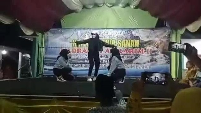 Sebelumnya, video itu memperlihatkan tiga gadis berjoget di atas panggung dengan latar bertuliskan 'Haflah Akhirussanah Madrasah Al Karim II Wetan Dalem Pulokerto Kraton Pasuruan.'
