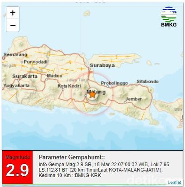 "Iya pagi ini, ada gempa. Tapi kecil (2.9 M) dan gak dirasakan," ujar Kepala Stasiun Geofisika Malang, Ma'muri saat dikonfirmasi detikJatim, Jumat (18/3/2022).