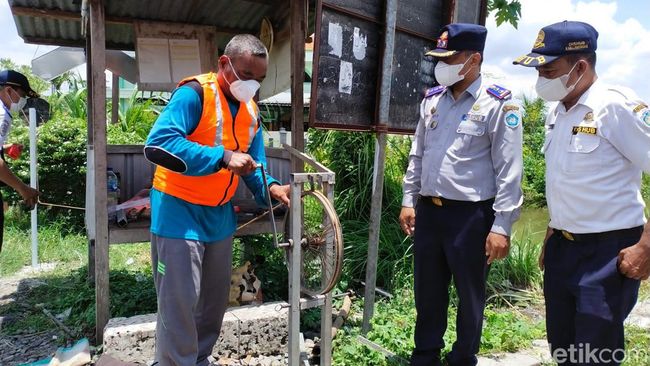 Warga Desa Sogo, Kecamatan Babat membuat palang pintu perlintasan Kereta Api (KA) semi otomatis. Mereka berinovasi dengan barang bekas.