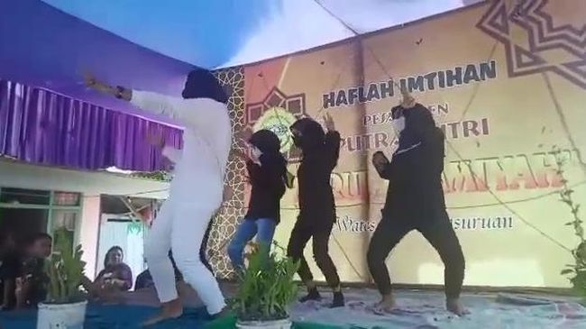 Aksi joget TikTok empat perempuan di Haflah Imtihan Pesantren Putra-Putri Nurul Islamiyah, Desa Wates, Kecamatan Lekok, Kabupaten Pasuruan viral. Empat perempuan yang joget itu santri setempat.