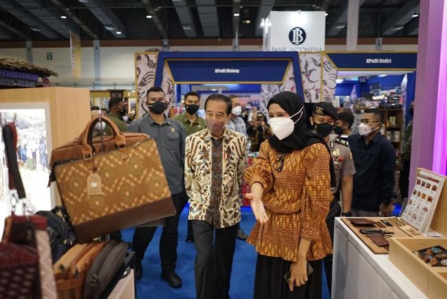 Presiden Joko Widodo membuka pameran International Handycraft Trade (Inacraft) 2022 di Jakarta Convention Center, Rabu (23/3). Jokowi memuji Tenun Ikat Kediri hasil para perajin.