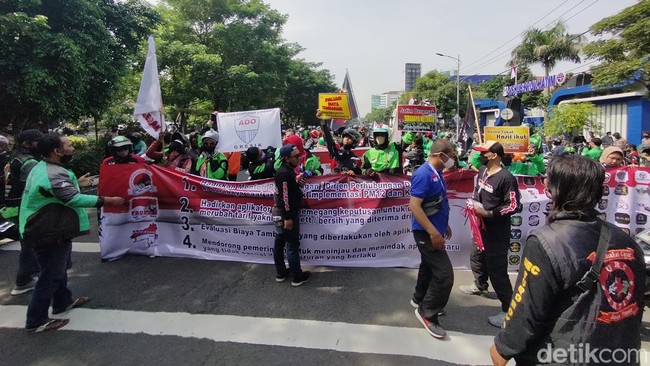 Demo dimulai sejak pagi. Tampak sejumlah driver ojol mengenakan atribut aplikator masing-masing. Selain itu, ada juga yang mengendarai mobil dan truk dengan pengeras suara sebagai komando terdepan aksi massa.