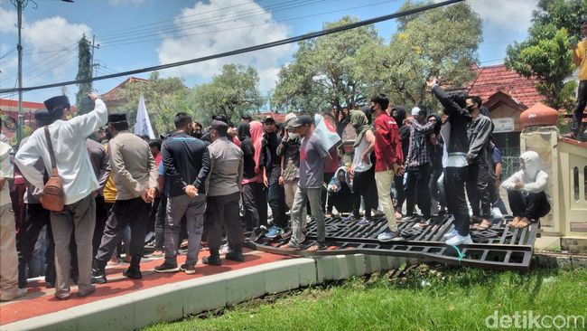 Aksi itu diikuti puluhan massa lainnya yang mulai menyasar pagar besi gerbang Kantor Pemkab. Mereka mulai menggoyang pagar itu lalu mendobraknya hingga roboh.