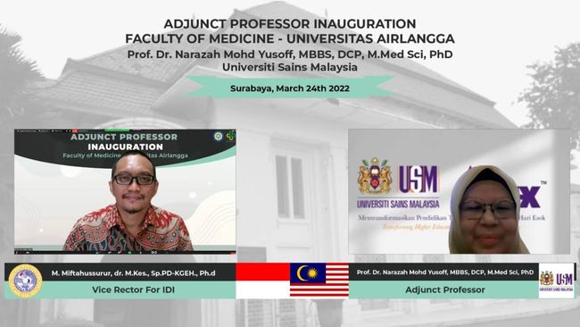 Fakultas Kedokteran Universitas Airlangga (FK Unair) menggandeng guru besar University Sains Malaysia (USM), Prof Narazah Mohd Yusoff menjadi adjunct professor. Pengangkatan adjunct professor ke-10 itu diharapkan dapat mendukung upaya go-internasional FK Unair.