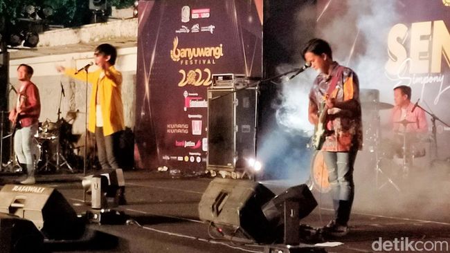 Sementara sang Gitaris, Nurul Damar Ramadan mengenakan perban di dagu. D'Masiv menghibur masyarakat Banyuwangi di Gesibu Blambangan, Minggu (27/3/2022) malam.