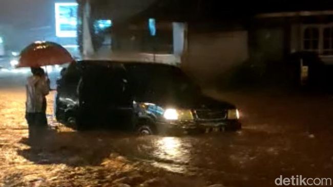 Pantauan detikJatim, Jalan Raya Gempol di sekitar Jembatan Viaduk terendam banjir sejak pukul 19.20 WIB. Akibatnya arus kendaraan sempat merambat.