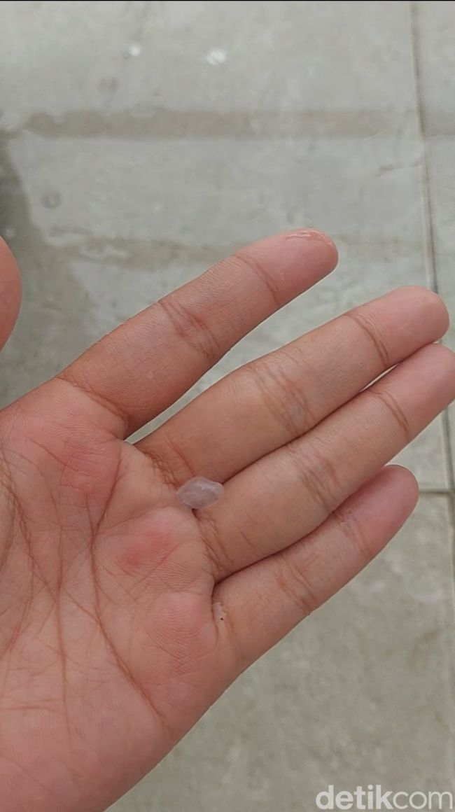 Butiran es yang jatuh itu tidak terlalu besar. Setelah hujan turun dengan sangat deras kemudian intensitasnya turun, butiran es itu turun cukup banyak.