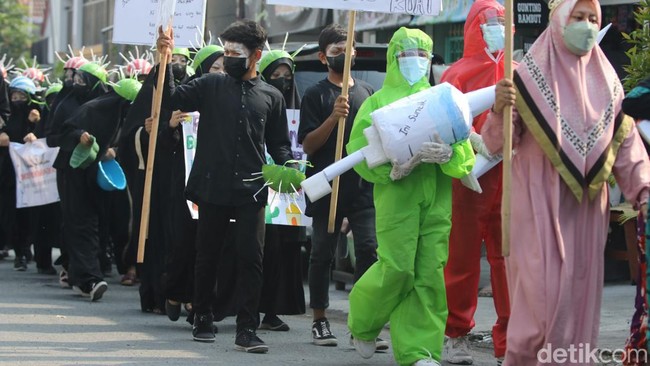 Pada Jumat (1/4/2022) siang, puluhan murid ini melakukan pawai berkeliling kampung. Mereka menggunakan beragam jenis pakaian dan poster yang unik, sembari bernyanyi dan menabuh alat musik.