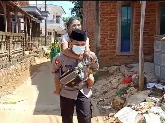 Meyakinkan warga kepulauan agar mau mengikuti vaksinasi COVID-19 bukan hal mudah. Tanyakan saja kepada Bripka Hamsun Bisri Samsuri yang menggendong Nenek Mariyaton warga disabilitas Pulau Kangean agar mau divaksin.