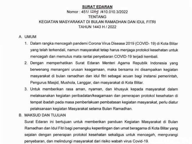 Dalam SE Wali Kota Blitar nomor 451/269/410.010.3/2022 diatur tentang prokes ketat ibadah selama bulan puasa dan aktivitas ekonomi warga kota. Seperti pemakain toa masjid/musala untuk tadarus hanya diizinkan sampai pukul 22.00 WIB.