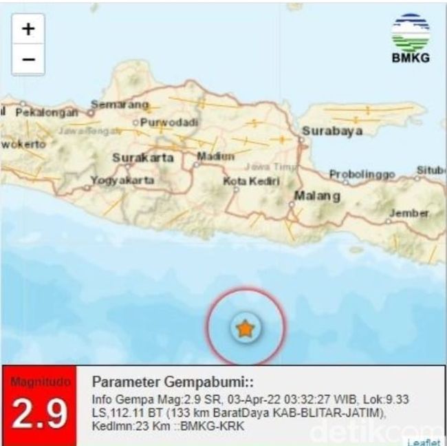 "Kedalaman 23 KM," tulis keterangan BMKG Pasuruan seperti yang dilihat detikJatim, Minggu (3/4/2022).